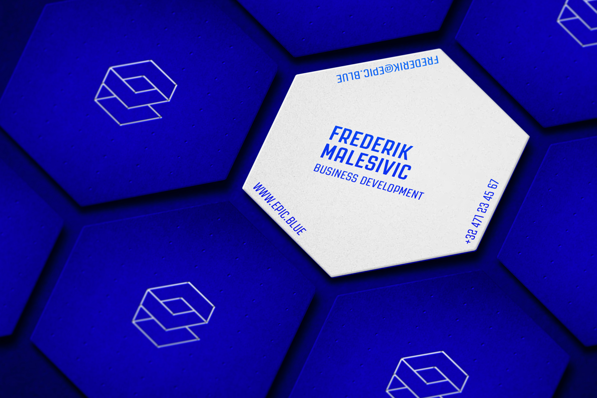 An isometric blueprint of a building is used as a basic shape for the logo to emphasize the indoor focus of Epic Blue.
